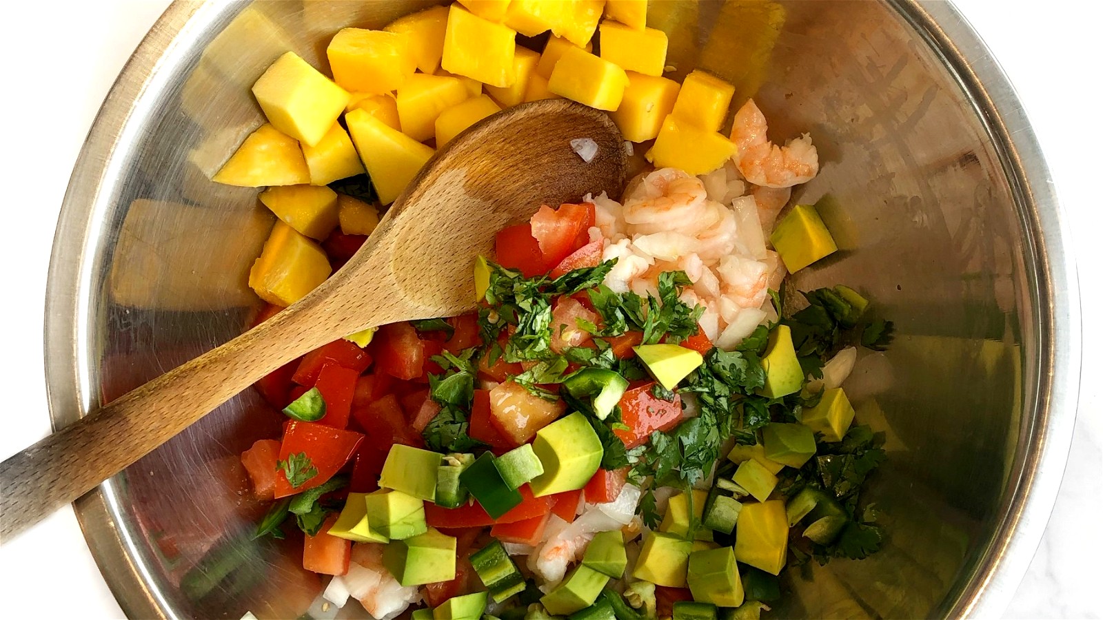 In another bowl combine the avocado, tomato, jalapeño and cilantro. Add the shrimp and onions and let marinate for another 10 minutes.